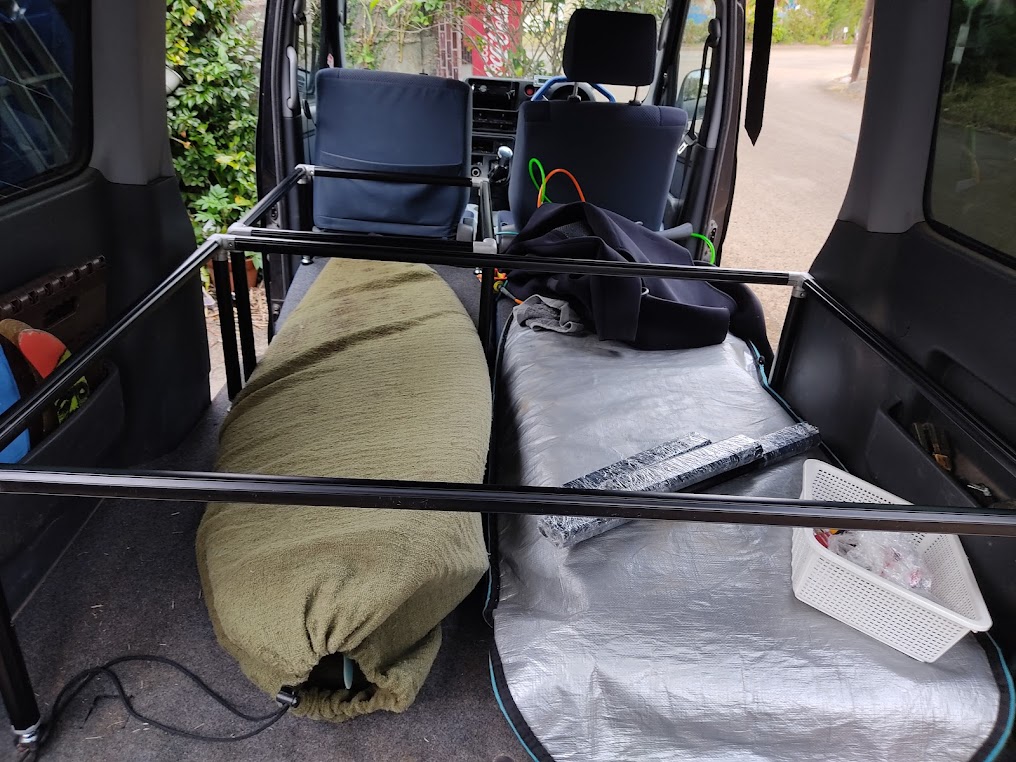 これでフルベッドにすれば下にショートボード3本と天井に2本の合計5本積んだまま就寝できる。